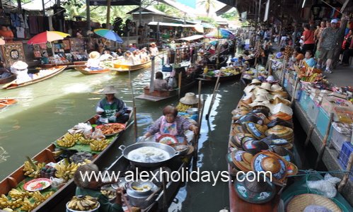 07.30 hrs. Visit Damnoen Saduak Floating Market : Along the water way very few are left today, Damnone Saduak is one of the last authentic Floating Market 100 kms. from Bangkok. On the way visit Coconut Sugar Farm and take a boat to Floating Market and visit the Royal Thai Handicraft Center. Direct to Kanchanaburi.