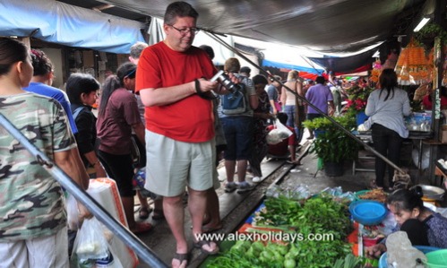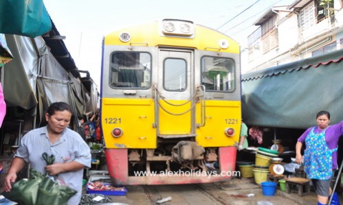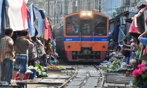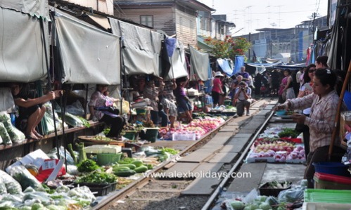 Depart from hotel for Folding Umbrella Market or Crazy market or Mae Klong Railway Market (i.e. Rom Hub Market) at Mae Klong Railway Station, in Samut Songkhram province. Rom Hub Market is truly a unique market, as it is located right on the railway track.