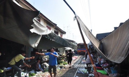 Whenever the train is approaching, all the vendors will quickly fold away their umbrellas or awnings and remove their stalls to let the train pass.